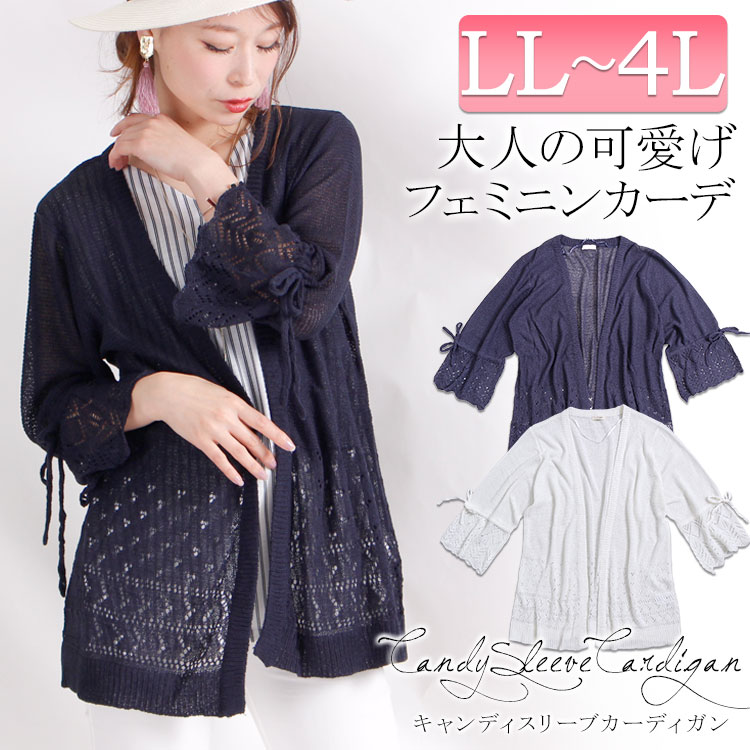 透かし編みキャンディスリーブカーディガン 大きいサイズ レディース カーディガン カーデ 羽織り カットワーク レース ロング 透け感 フレア 長袖 透け感 編み 伸縮 春 夏 夏新作 LL LLサイズ 2L 3L 4L XL XXL 13号 15号 17号 オフホワイト ホワイト 白 white ネイビー 紺