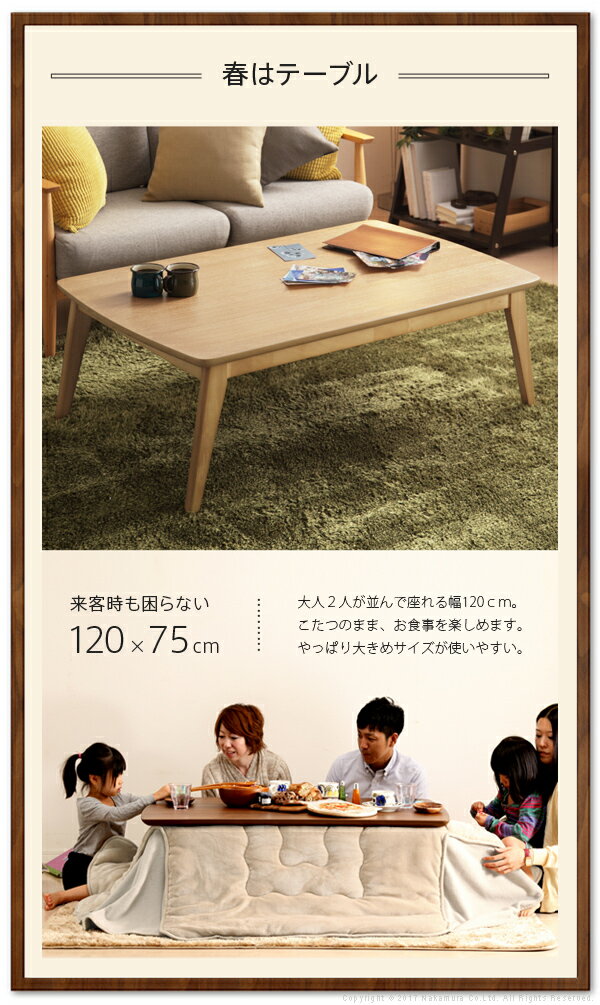 【セット構成】 こたつ本体x1 掛布団x1 【カラーバリエーション】 ■こたつ本体 ウォールナット(ブラウン)・オーク(ナチュラル) ■掛布団 レンガxブラウン・ベージュxグレー・グリーンxグレー・ネイビーxブラウン 【仕様】 ■こたつ本体 天板:天然木化粧繊維板(ウォールナット/オーク) 幕板・脚部:天然木(ラバーウッド) 石英管ヒーター(500W、中間スイッチ式) ◎一部組立 ■掛布団 表地:ポリエステル100% 裏地:ポリエステル100%(フリース) 撥水・防汚加工 【サイズ】 ■こたつ本体 幅120x奥行75x高さ39.5cm 重量:約20kg 天板サイズ:幅120x奥行75cm・厚み30mm・約11.8kg ■掛布団 サイズ:230x190cm・中綿:約980g やぐら面サイズ:120x80cm 株式会社ナカムラ(i-5700280)